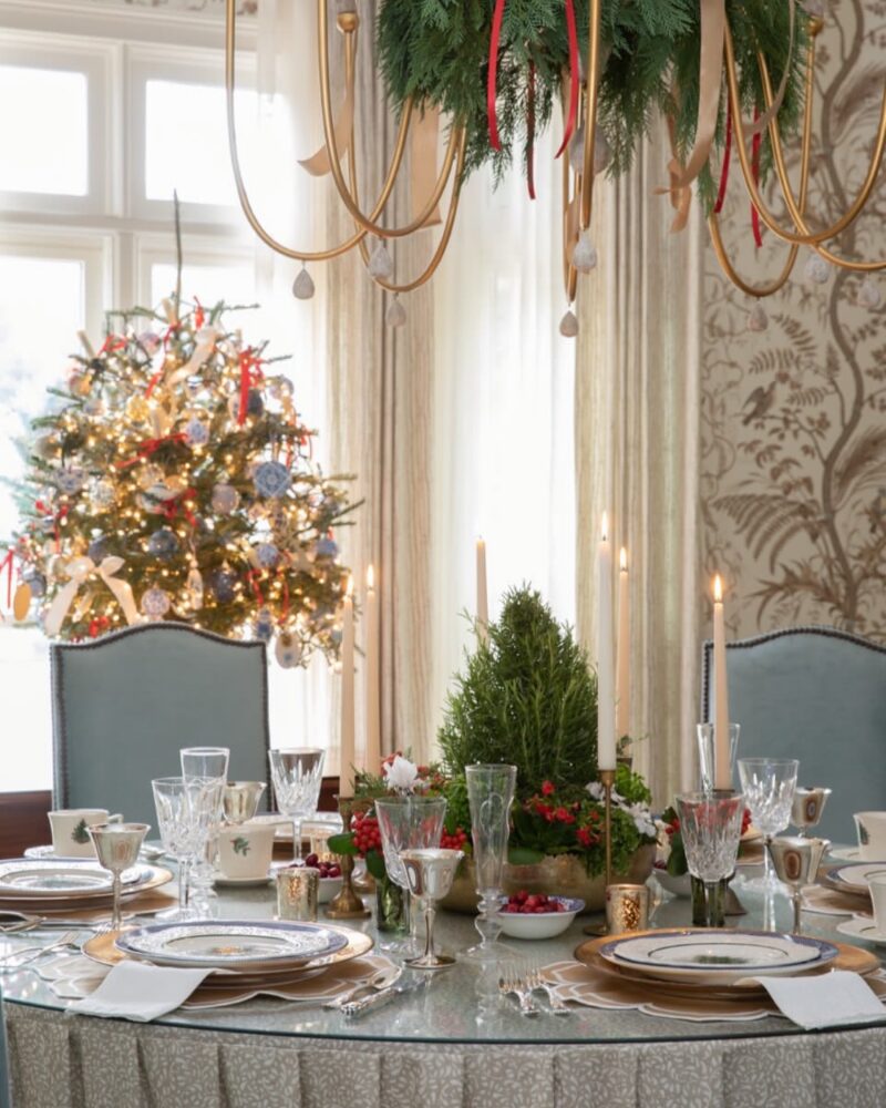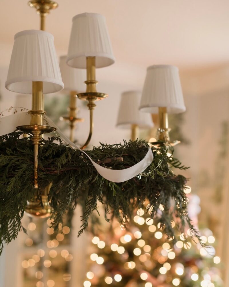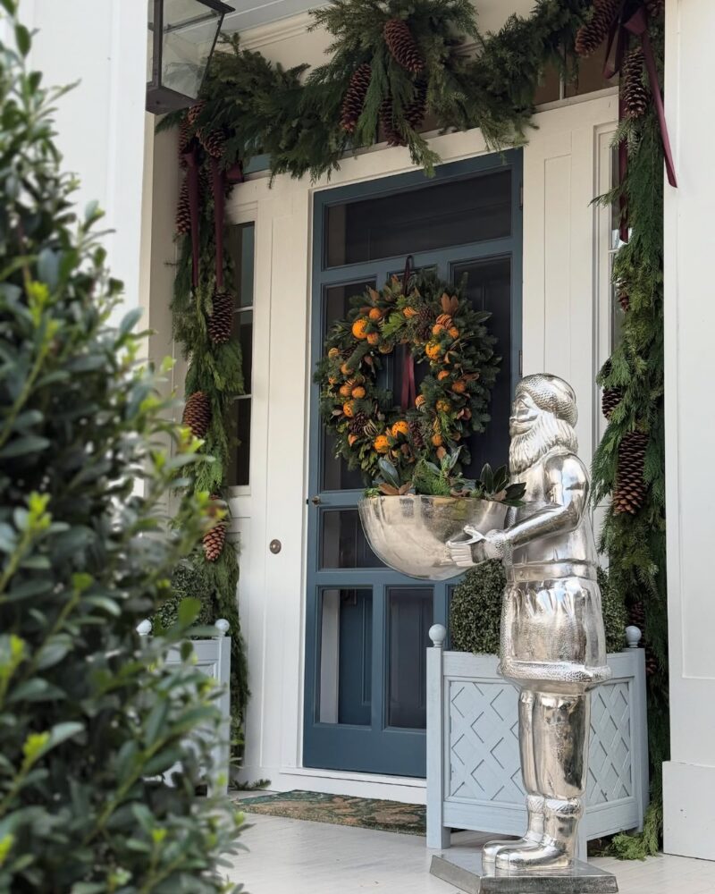 This porch feels relaxed, charming, and unmistakably festive. Lush garlands frame the doors and windows, paired with a full wreath and subtle ribbon details. The result is a welcoming, lived-in holiday look that feels just right for greeting guests—or enjoying a quiet moment outside. Designed by Laurie Miller Designs in Little Rock, Arkansas and co-owner of Shop Gloriette.