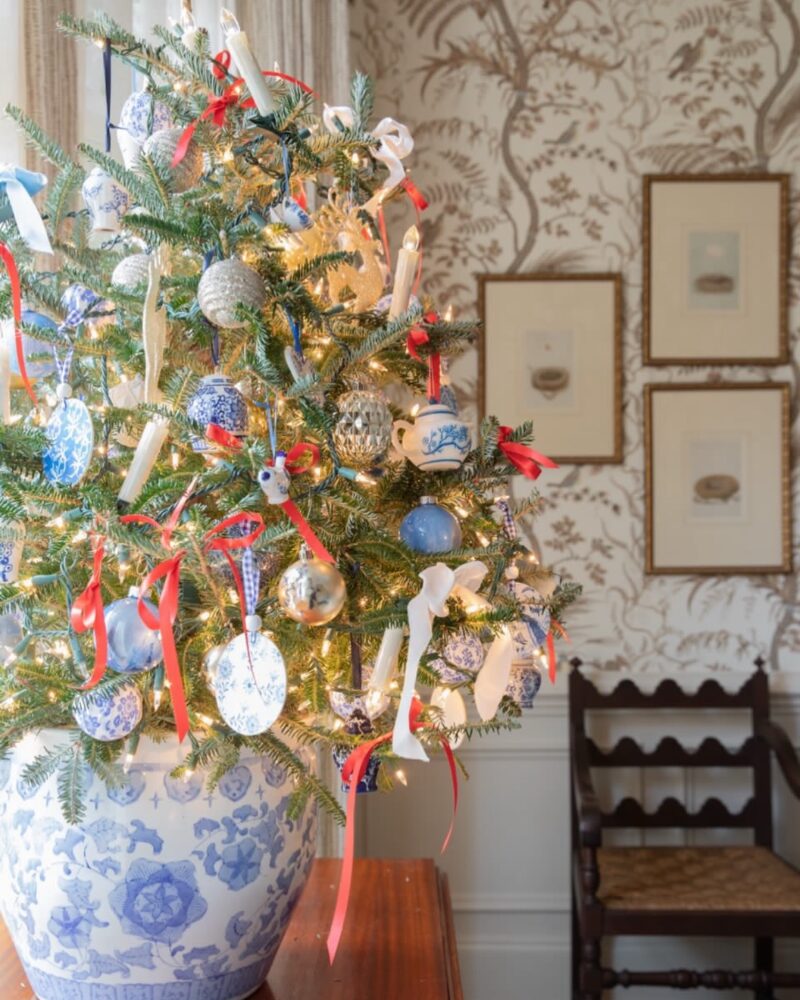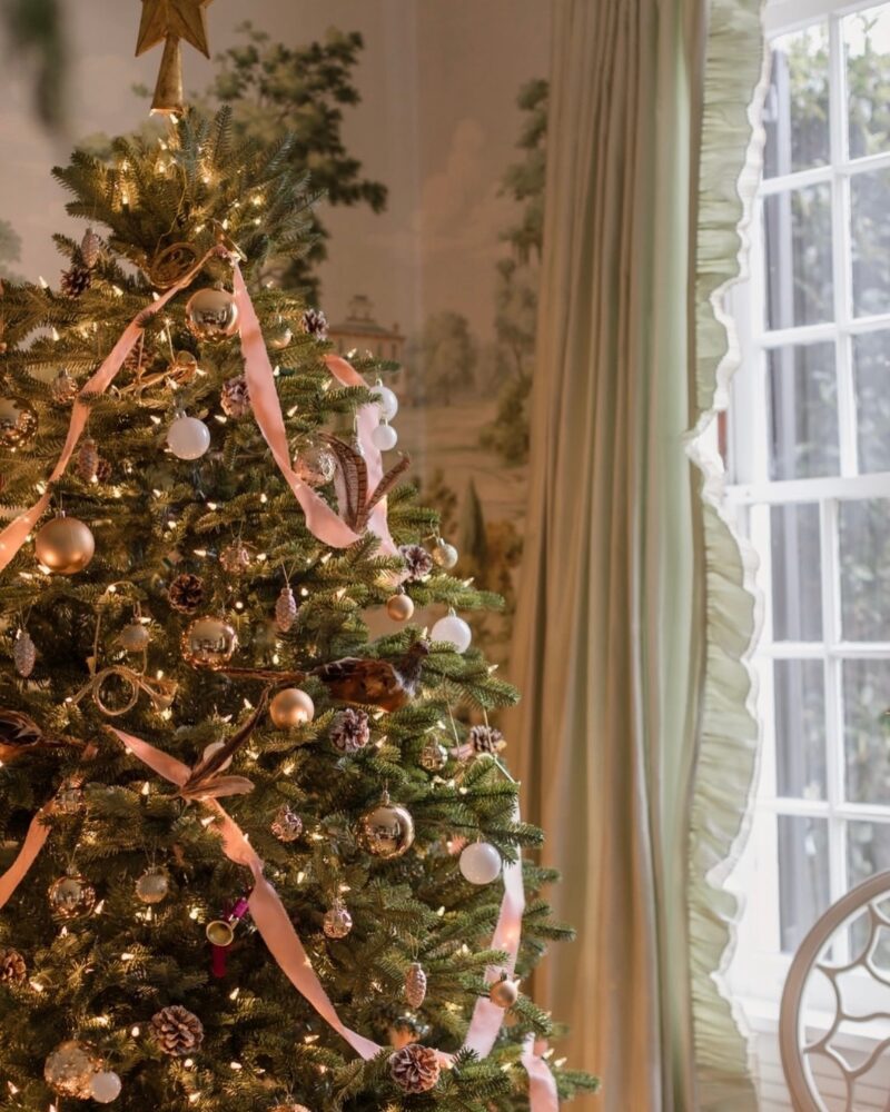 This look leans into soft layers and a warm glow. Blush ribbons, delicate ornaments, and twinkle lights give the tree a romantic feel without feeling fussy. Wrapped greenery overhead adds an effortless, collected touch and makes the room feel cozy, inviting, and ready for slow holiday evenings. Interior design and decor by Becky Nielson Interios in Nashville. Images by Mary Craven Photography.