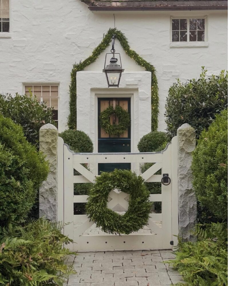 Sometimes simple really is best. Fresh wreaths and garland frame the front door with clean lines and natural texture, creating a welcoming first impression. Set against a soft white exterior, the greenery feels timeless and elegant—proof that classic Christmas décor never goes out of style. This stunning home was designed by Paul Bates Architects in Birmingham, AL.