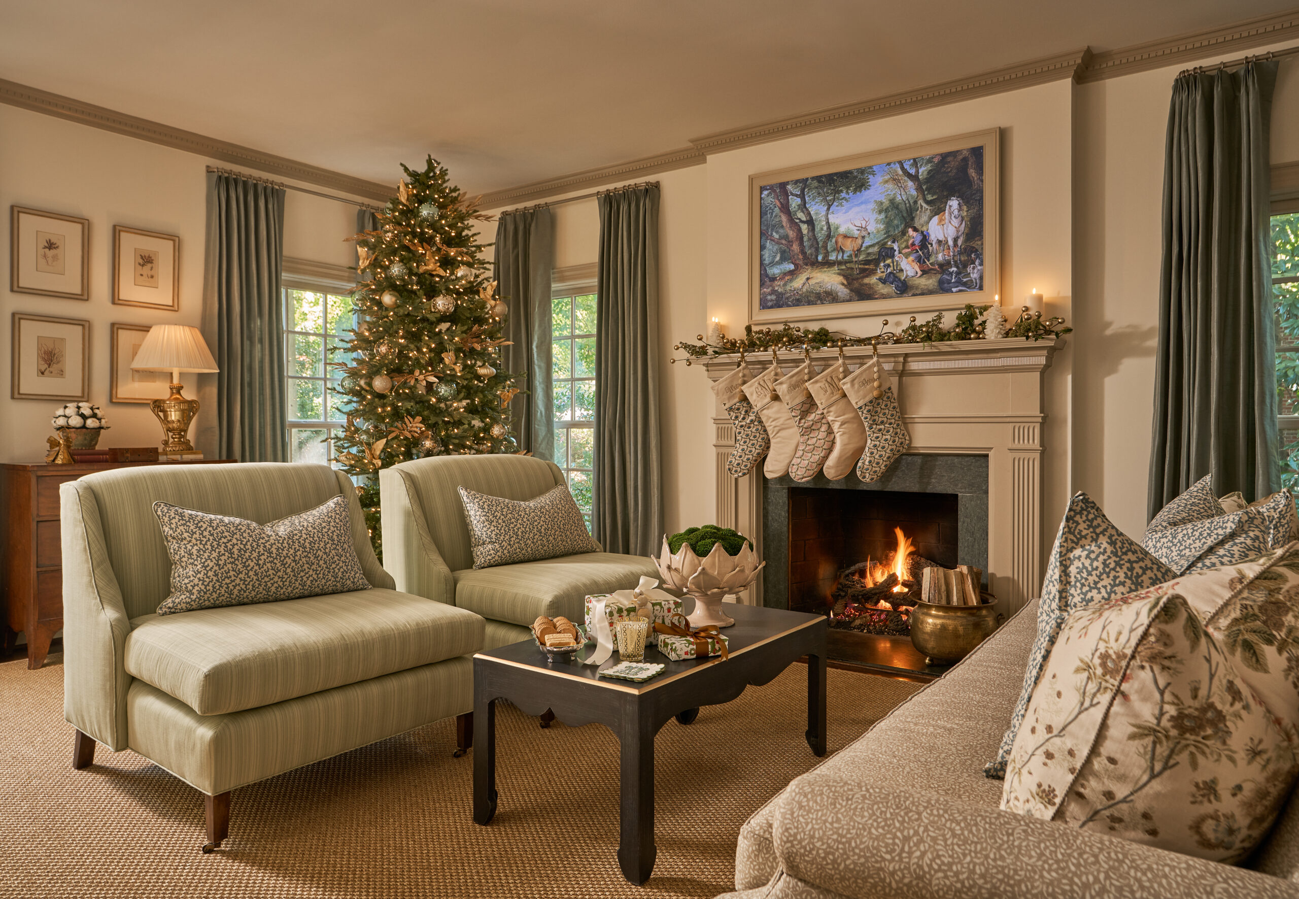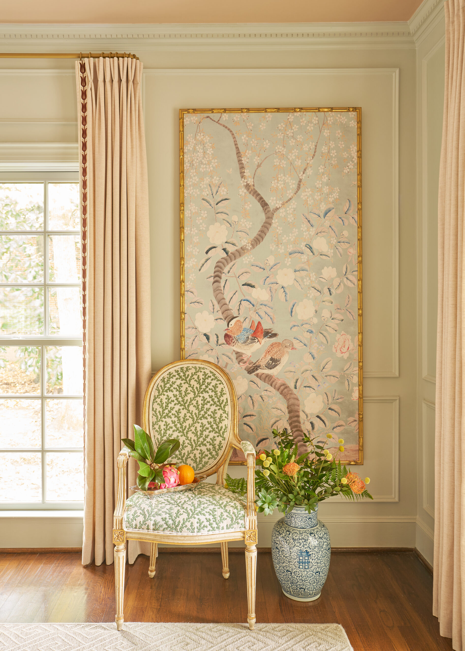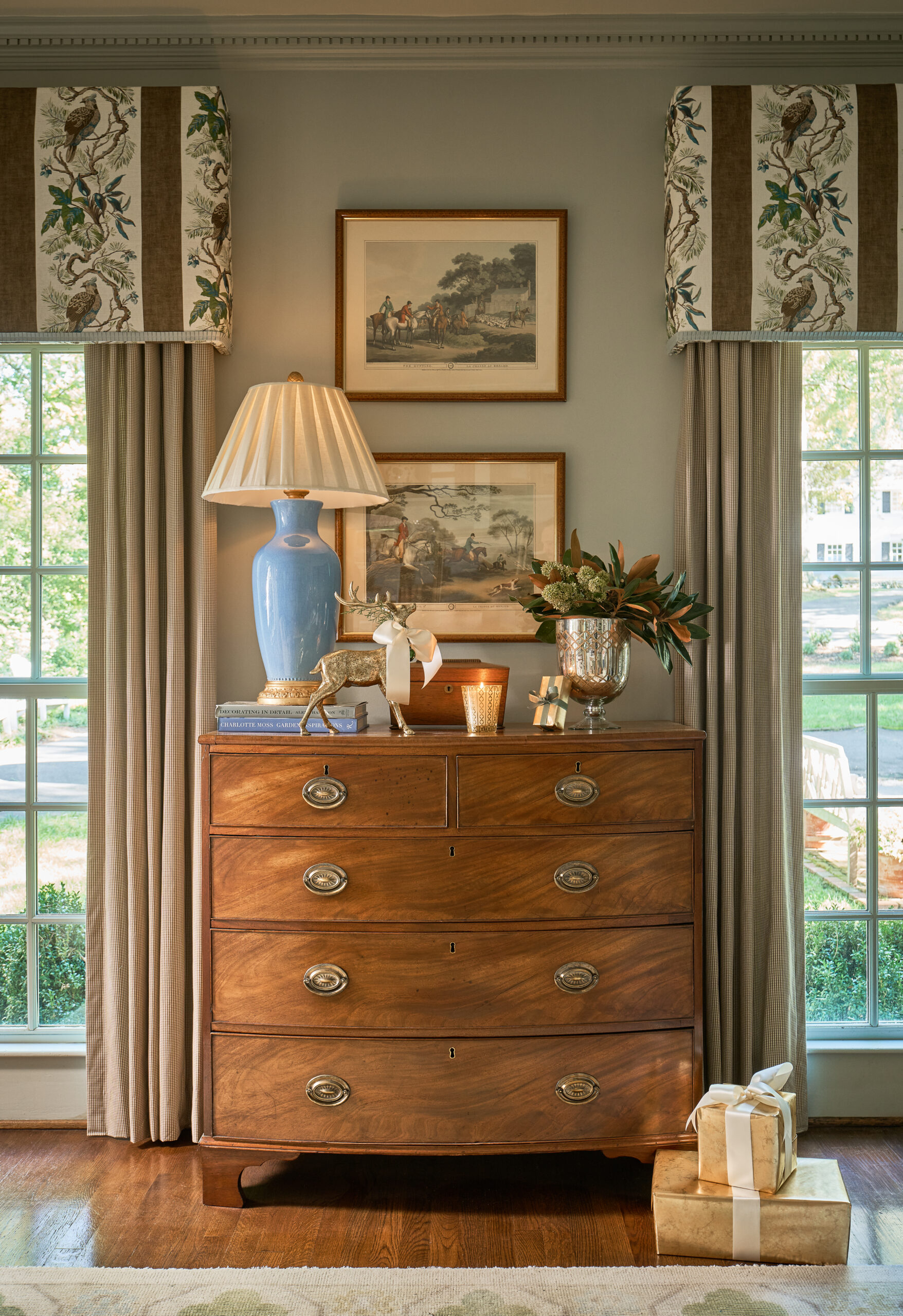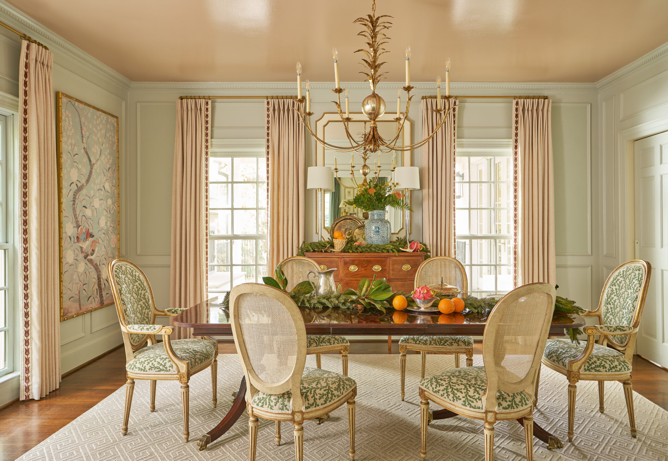 In the article, our house is described as being layered in muted colors and textures, with botanical prints and antiques that evoke a sense of Southern charm and timeless tradition. In the conversation room, the small brown check Schumacher drapes and the custom rug from English Village Lane with a topiary-tree motif anchor the space. In the living room and dining room, the mix of antique furnishings, soft, neutral tones and curated patterns made each area feel elegant, calm, and welcoming.