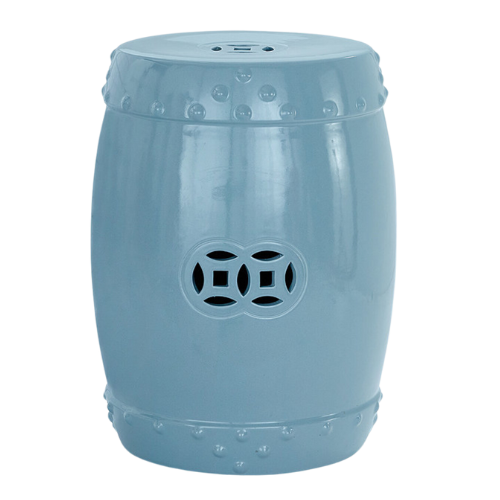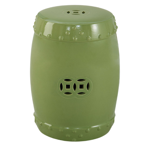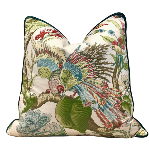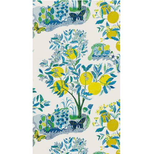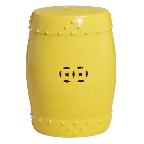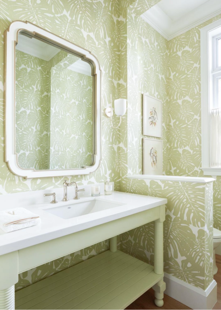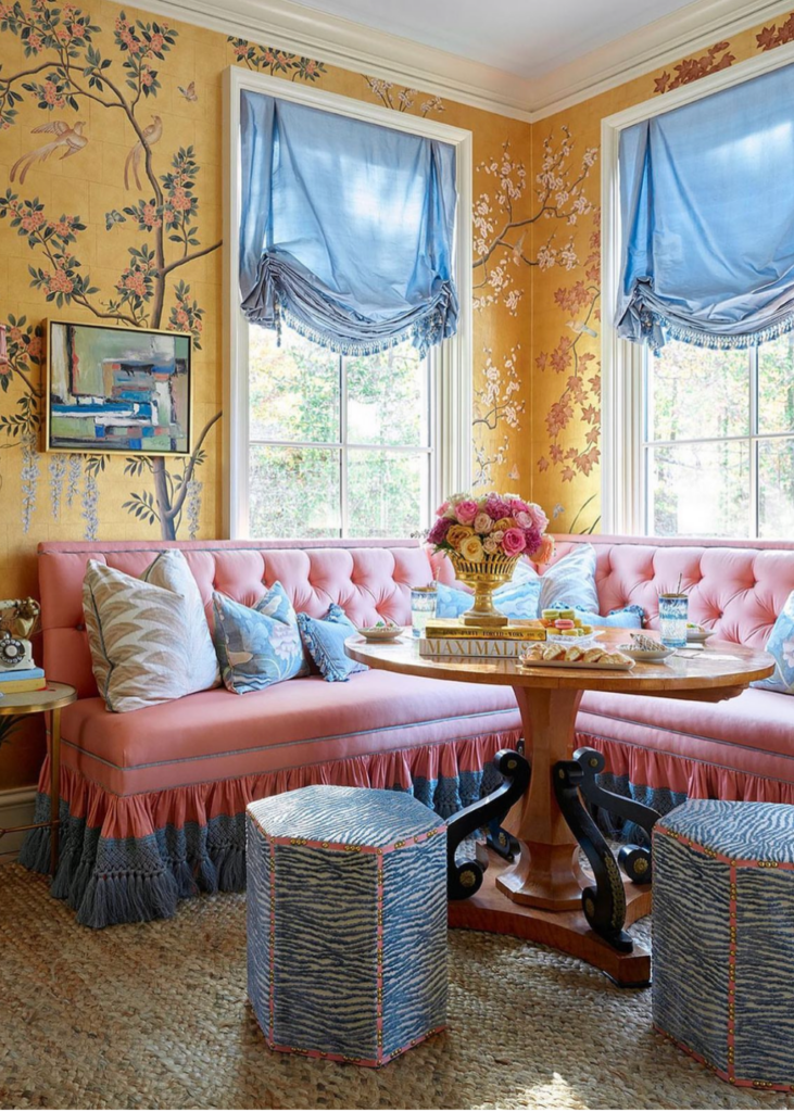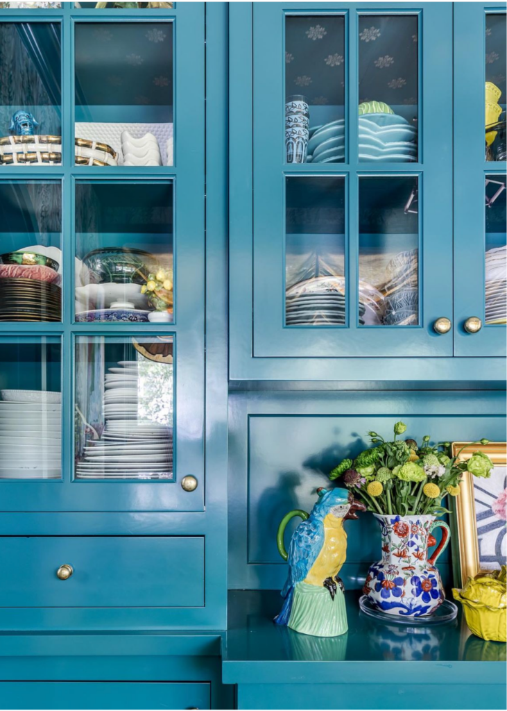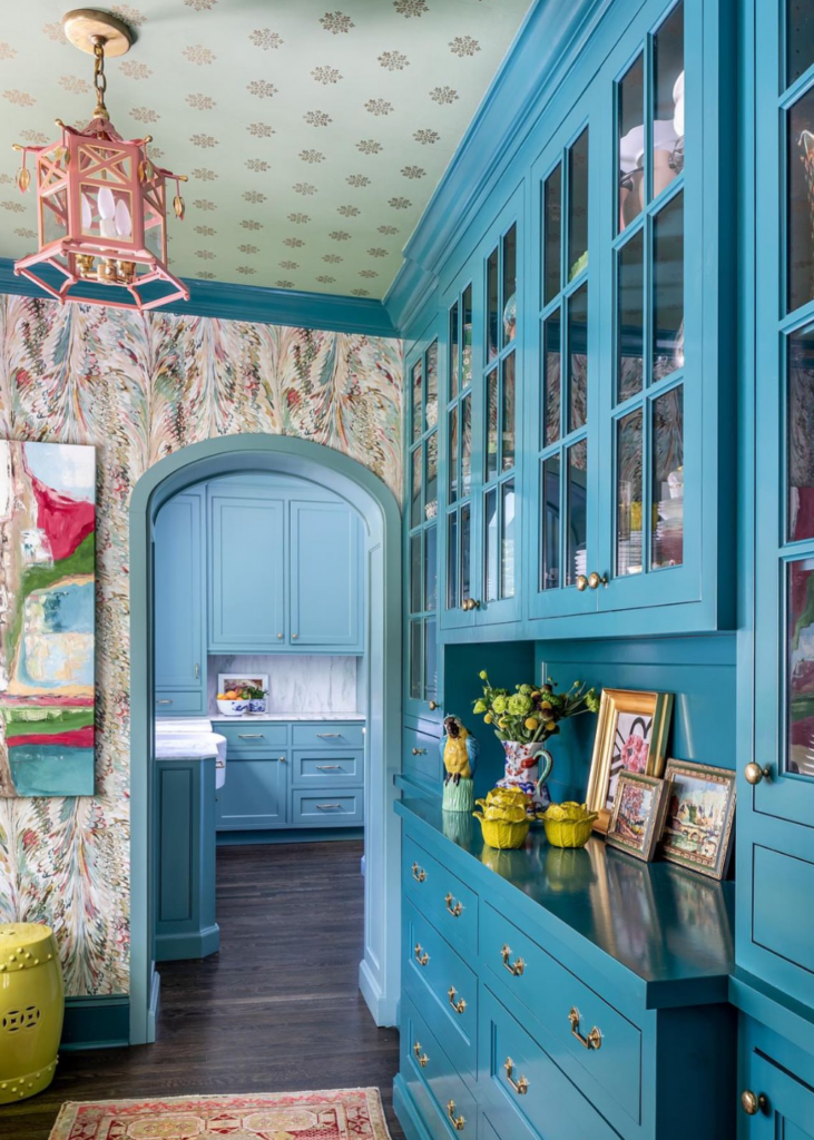Mallory and her team create bold statements with additional layers that are unexpected like this wallpapered geometric ceiling on the fourth wall and an abstract multi-color wallpaper on the vertical walls. Notice the yellow garden stool adjacent to the yellow cabbage dishes and antique parrot to balance the colors throughout the space.